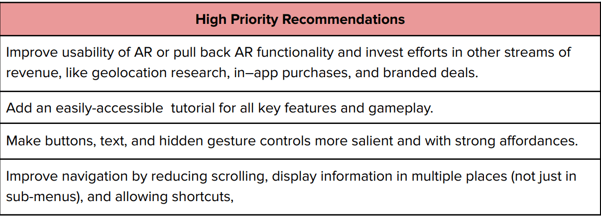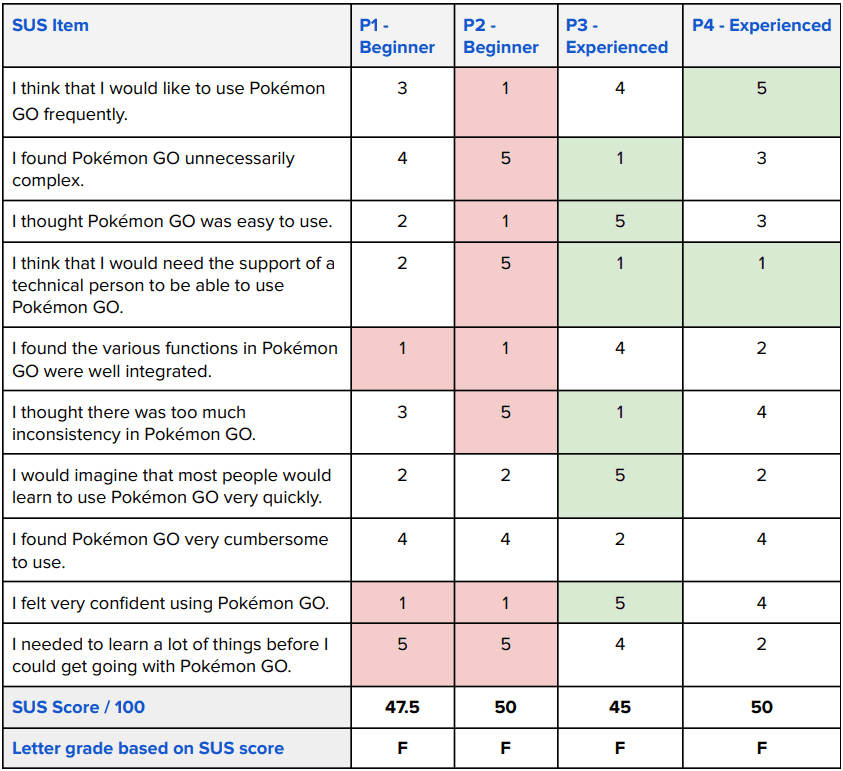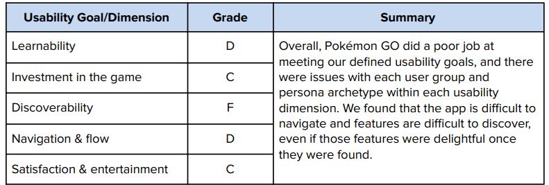 using the product again or recommending it to a friend. The results of the SUS validate the observations we had during our usability test: that Pokémon GO struggles significantly in terms of Learnability and Discoverability